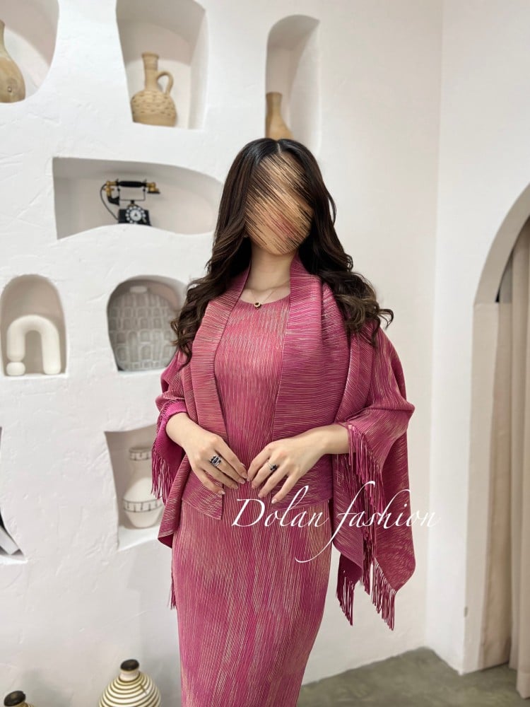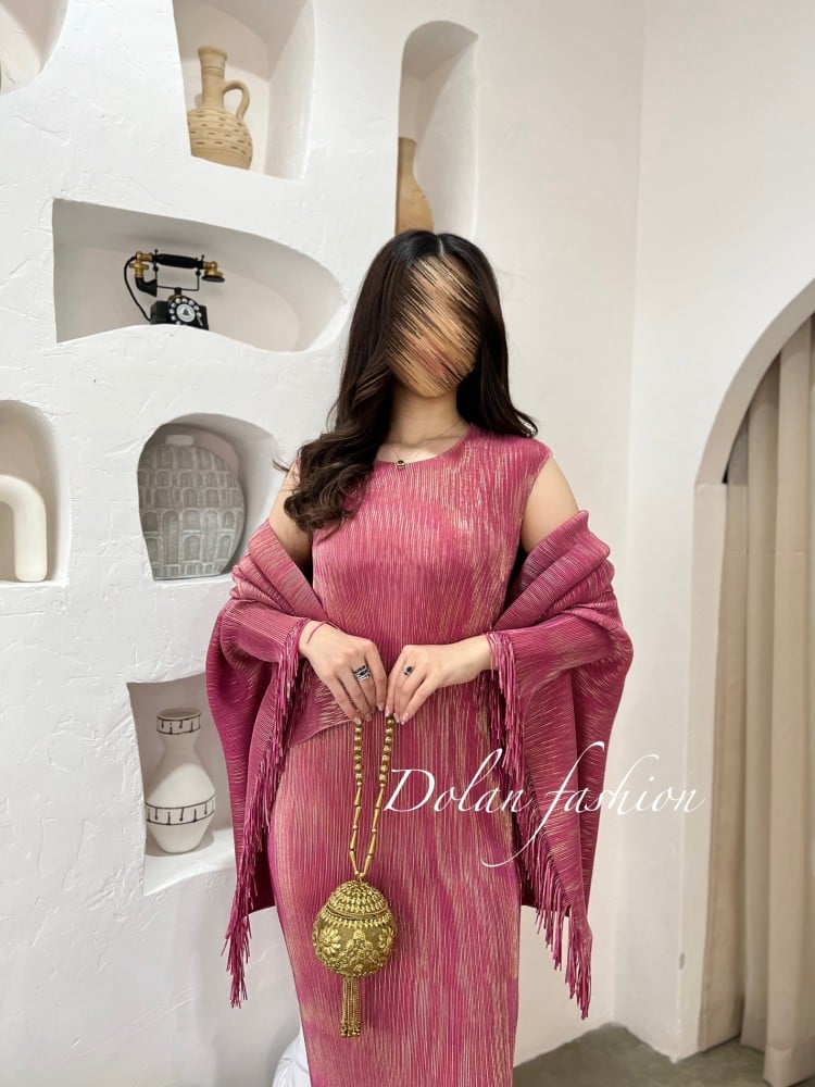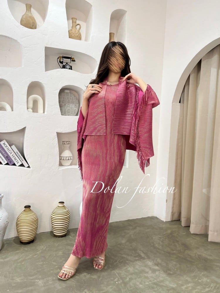 فستان مكسي مكون من قطعتين يتميز بجاكيت كروب قابل للاستخدام كسكارف، مصنوع من قماش بلاسيه عالي الجودة منسوج بخيوط ذهبية. تصميم أنيق يبرز أناقة القوام بلمسات فاخرة، مثالي للمناسبات والسهرات.