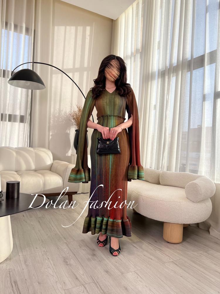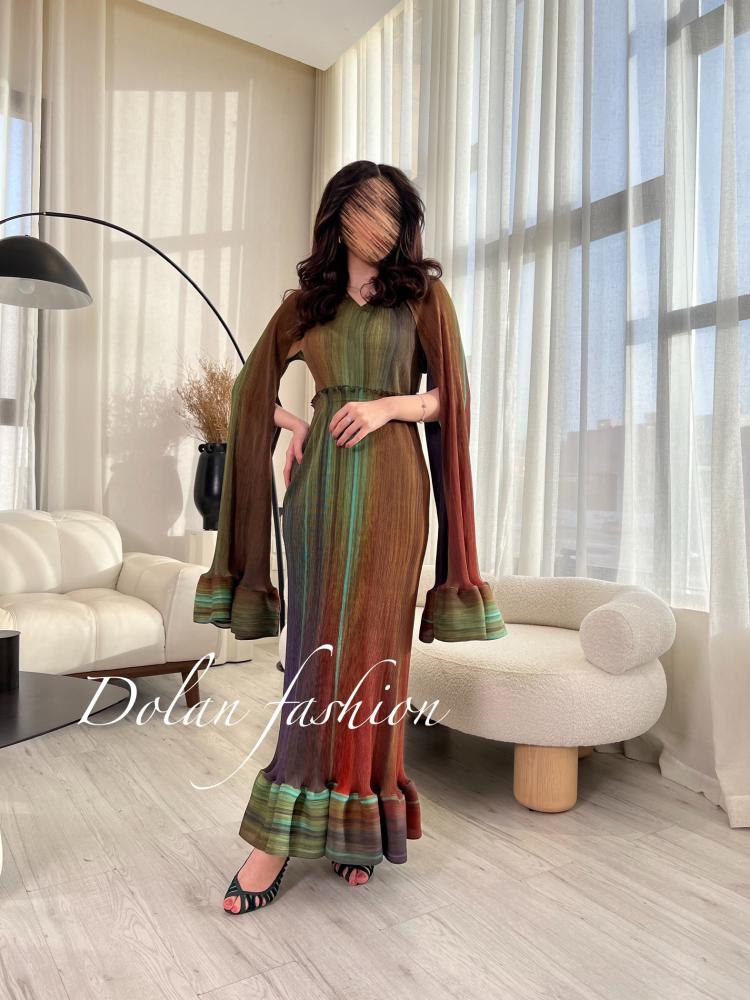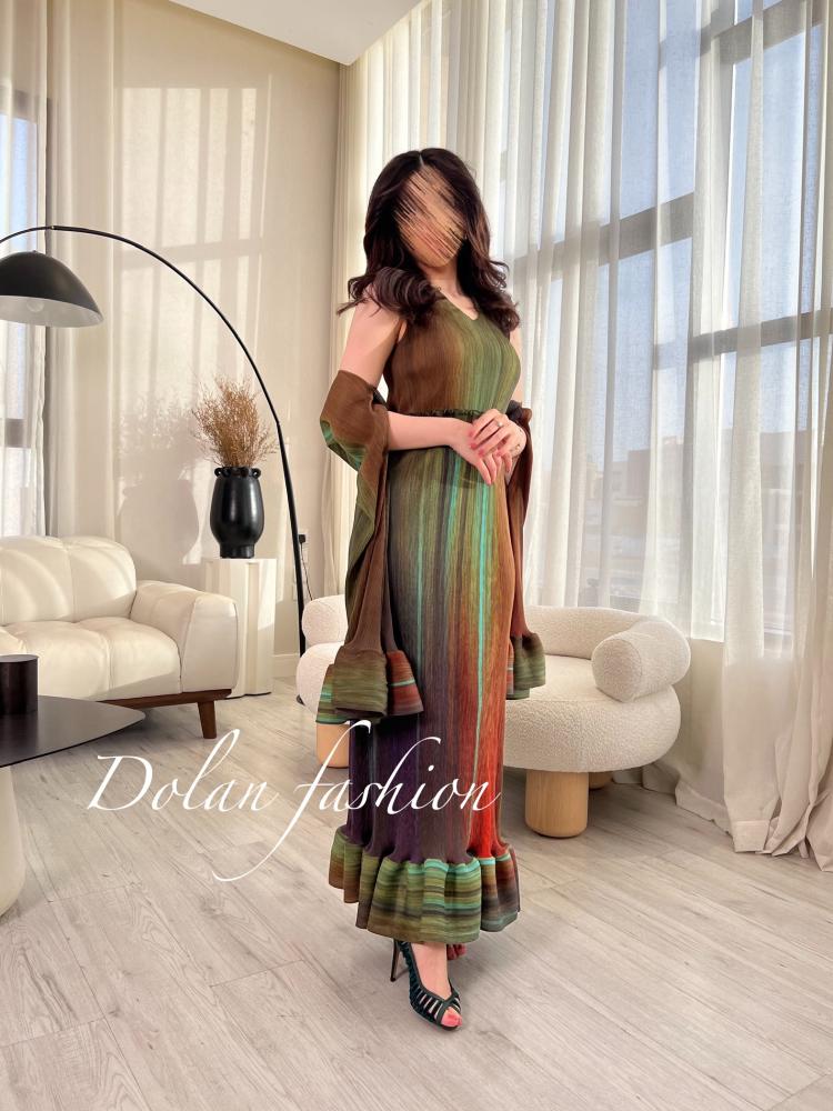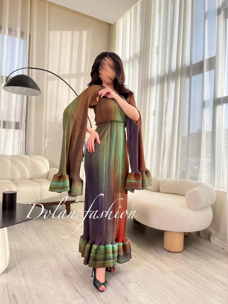 فستان أنيق بخامة البلاسيه الفاخرة، يتميز بتدرج ألوان راقية تمنحه مظهراً فريداً وجذاباً. يأتي الفستان بتصميم ماكسي طويل، مع قصة صدر مميزة تضفي لمسة من الأنوثة والرقي. والأكمام المنفصلة تضيف لمسة فخامة وأناقة على الإطلالة، مما يجعله اختياراً مثالياً للمناسبات الخاصة.